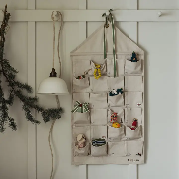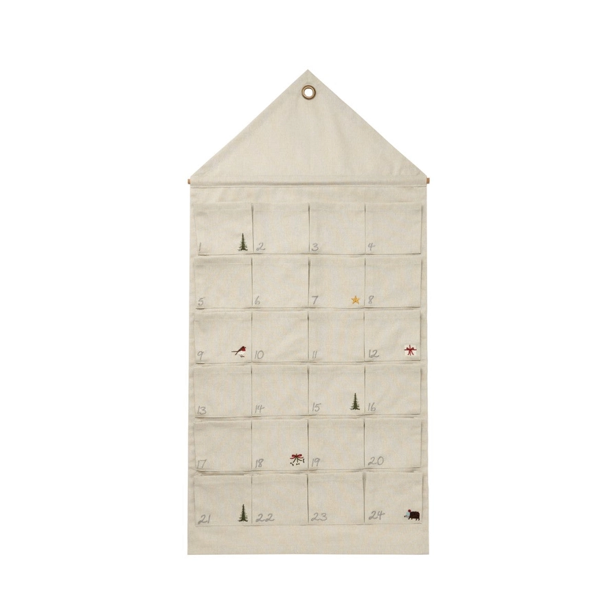 Sophie Allport – Adventskalender aus 100% Baumwolle mit 24 nummerierten Taschen. Neutrales Design mit festlichen Stickmotiven – wiederverwendbar. Perfekt für die Vorweihnachtszeit!
