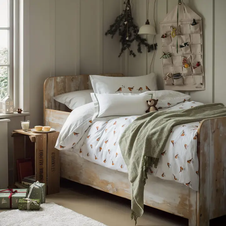 Gefertigt aus 100 % Baumwolle, mit neutralem Farbton und dezenten, festlichen Stickmotiven wie Tannenbaum, Mistelzweig, Geschenk, Stern, Rotkehlchen und Igel – ein elegantes Design, das sich harmonisch in verschiedenste Wohnräume einfügt.
