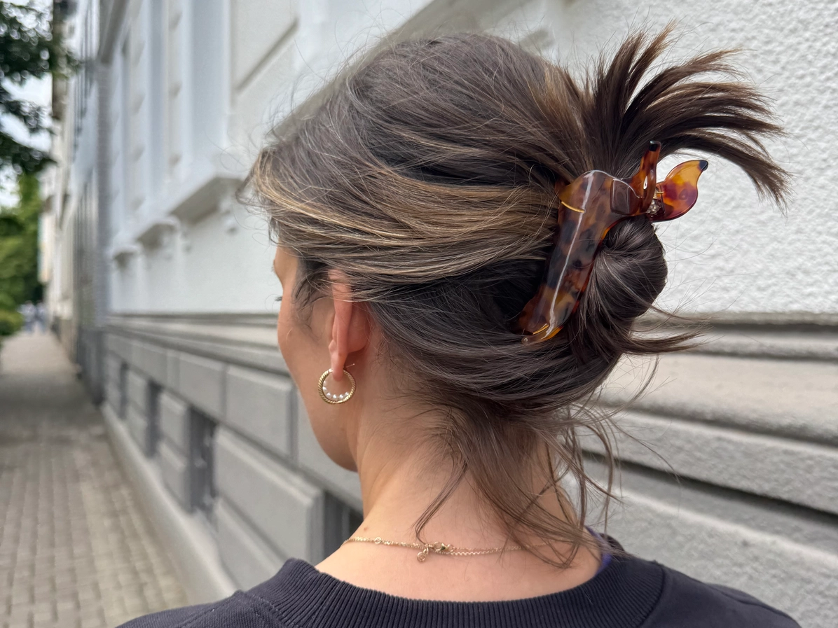Mit 9.5 × 5 × 4,5 cm ist die Spange gross genug für Halt und Ausdruck, ohne zu schwer zu sein.