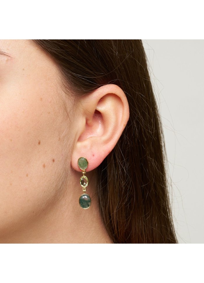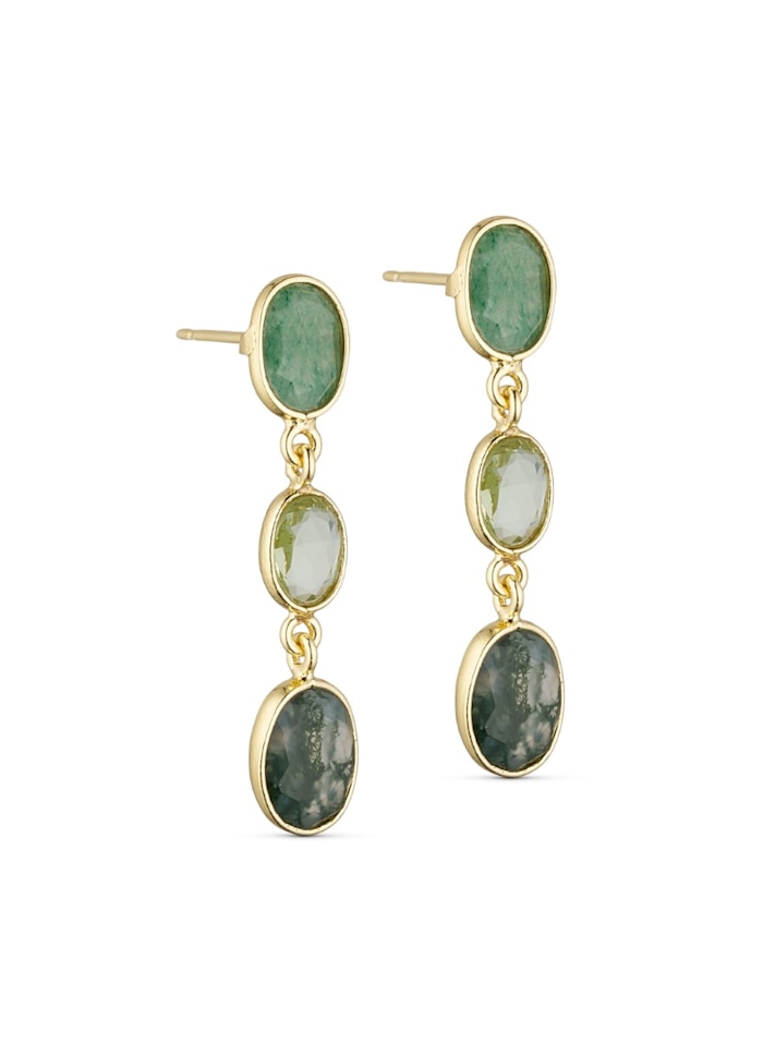 Mit den Ohrringen Amira von PURE by Nat holst du dir einen stilvollen Begleiter für deinen Alltag und besondere Momente. Die Ohrringe bestehen aus drei oval geschliffenen Natursteinen, die harmonisch abgestimmt von oben nach unten verlaufen. Jeder Stein ist in eine feine goldfarbene Fassung eingefasst und durch kleine Ösen beweglich miteinander verbunden – so schwingen sie bei jeder Bewegung elegant mit.