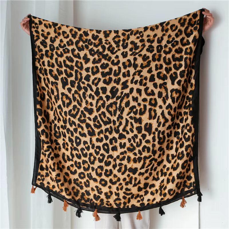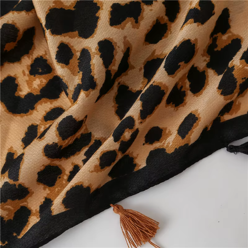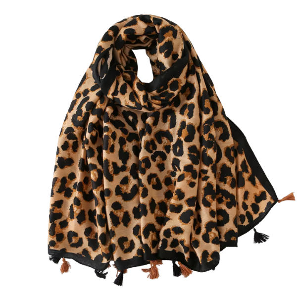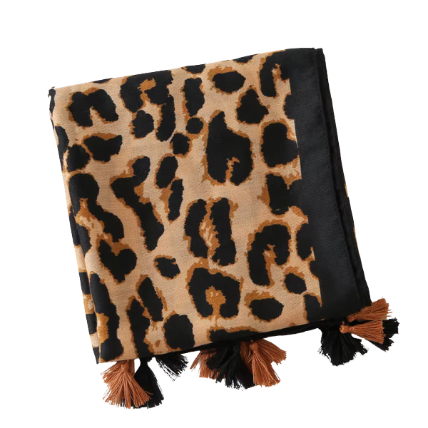 Leichter Schal mit Leopardenmuster und auffälligen Details. Weich, vielseitig kombinierbar und mit dekorativen Quasten.