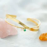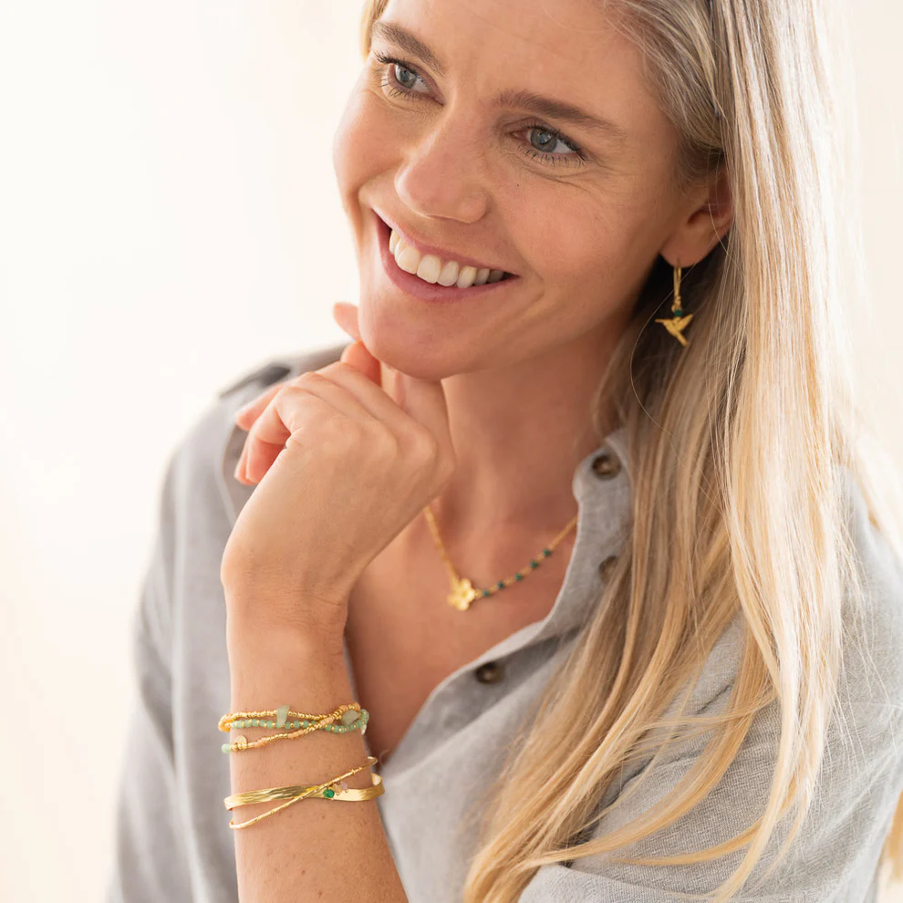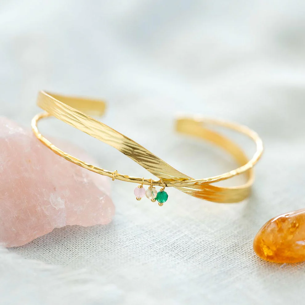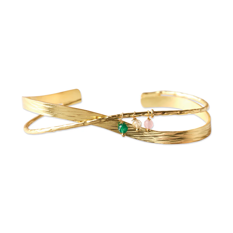 Das Tolerant Armband besticht durch sein offenes, verstellbares Design aus vergoldetem Messing, das mit drei kleinen, facettierten Edelstein-Anhängern veredelt ist: Citrin, Aventurin und Rosenquarz. Citrin schenkt dir Glücksgefühle und Optimismus, Aventurin ermutigt dazu, deinem eigenen Weg mutig zu folgen, und Rosenquarz fördert Liebe, Harmonie und Herzenswärme.