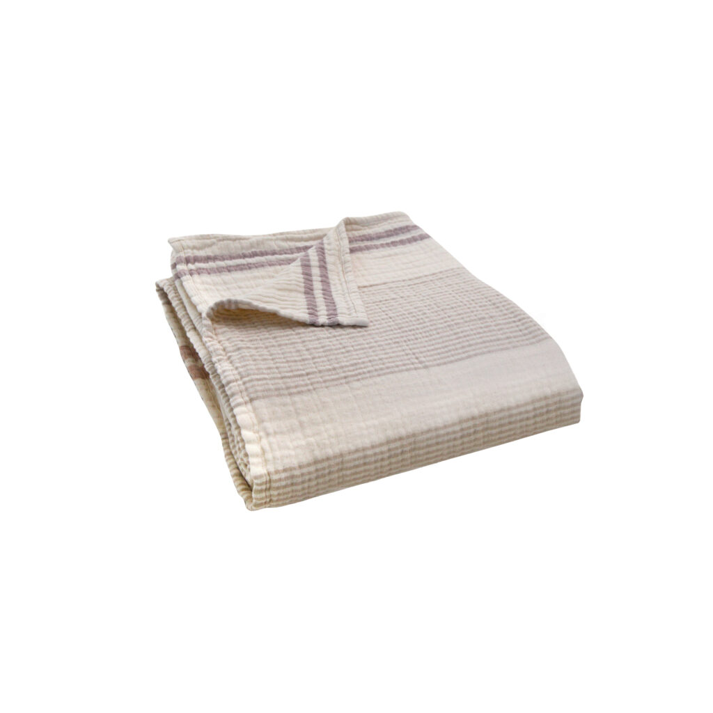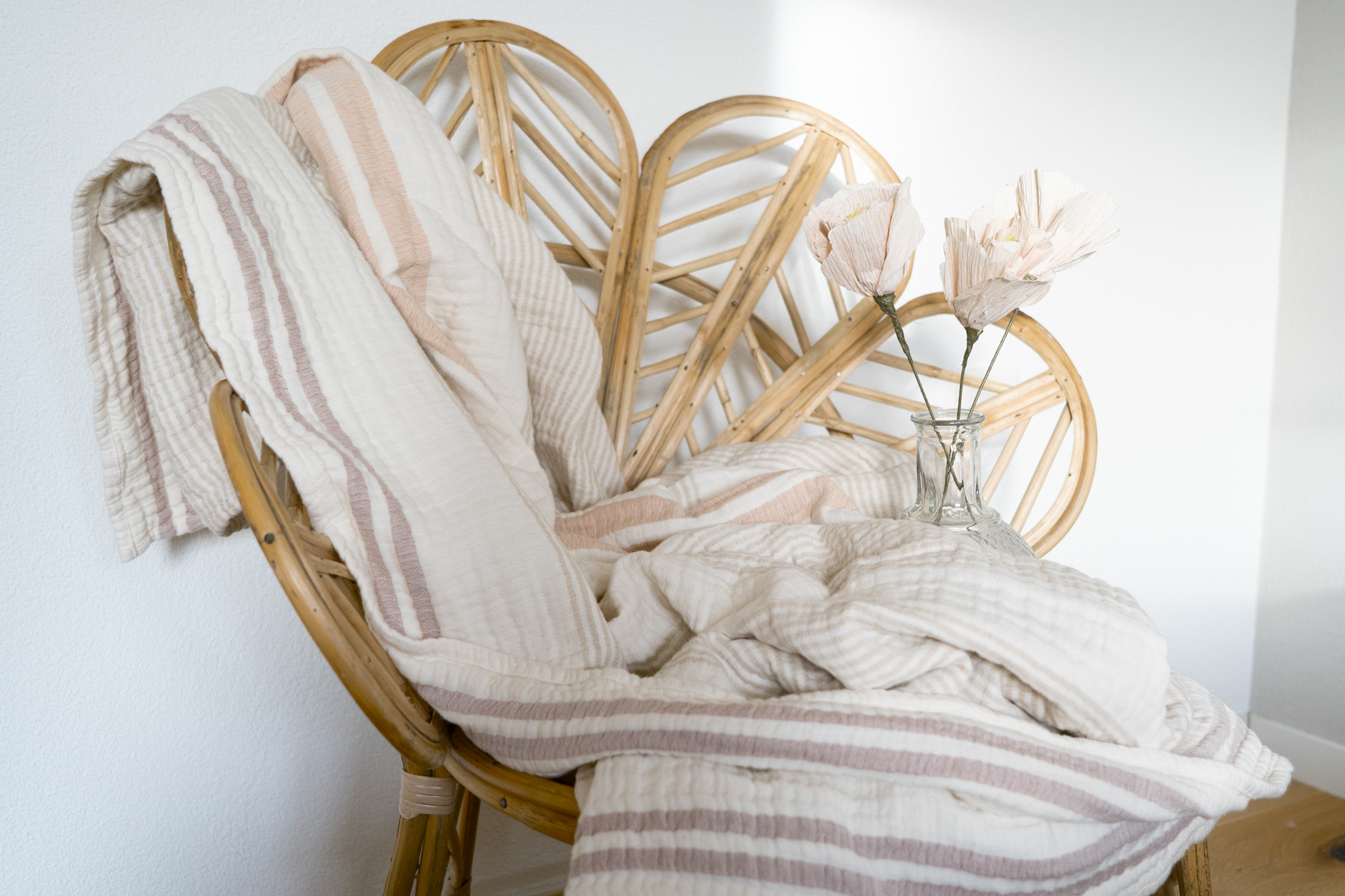 Farbliebe – Vielseitige Musselin-Decke (140 × 200 cm) aus 100 % Baumwolle, gestreift in beige und auberginentöne. Made in Portugal – leicht, weich, pflegeleicht – der kuschelige Allrounder für Sofa, Bett & Reise.