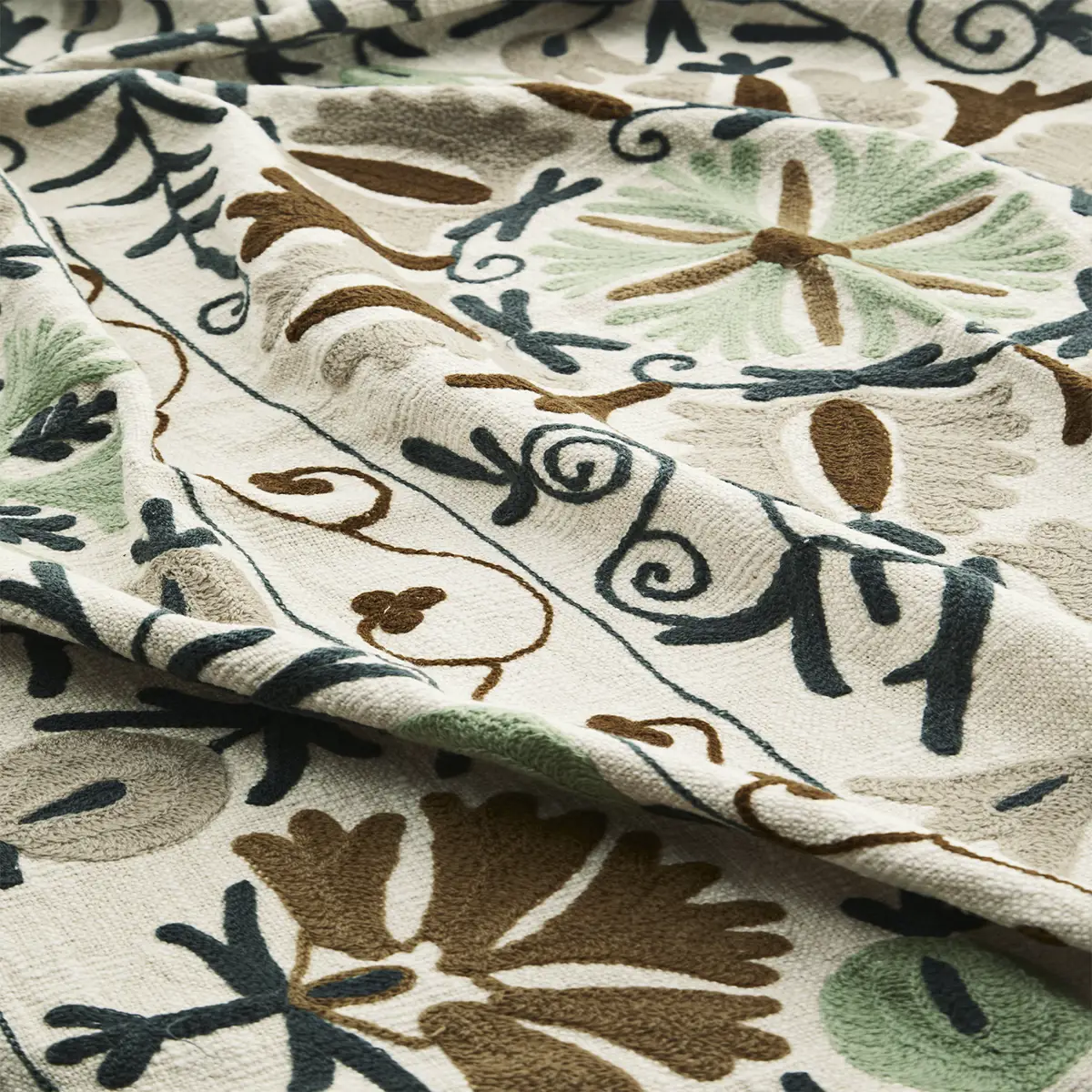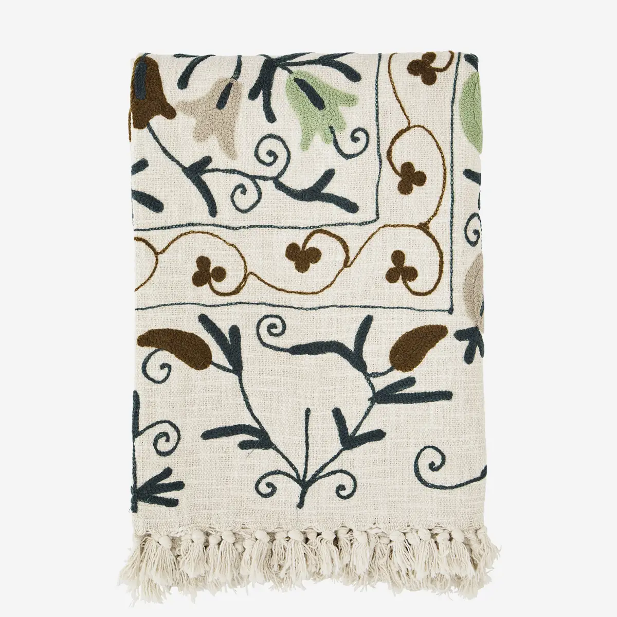 Madam Stoltz – Handbestickter Suzani-Baumwoll-Throw (130 × 180 cm) in Off-White mit floralen Suzani-Stickereien in Grün, Petrol, Tobacco & Grau. Kunstvoller Blickfang – elegant, traditionell, modern.